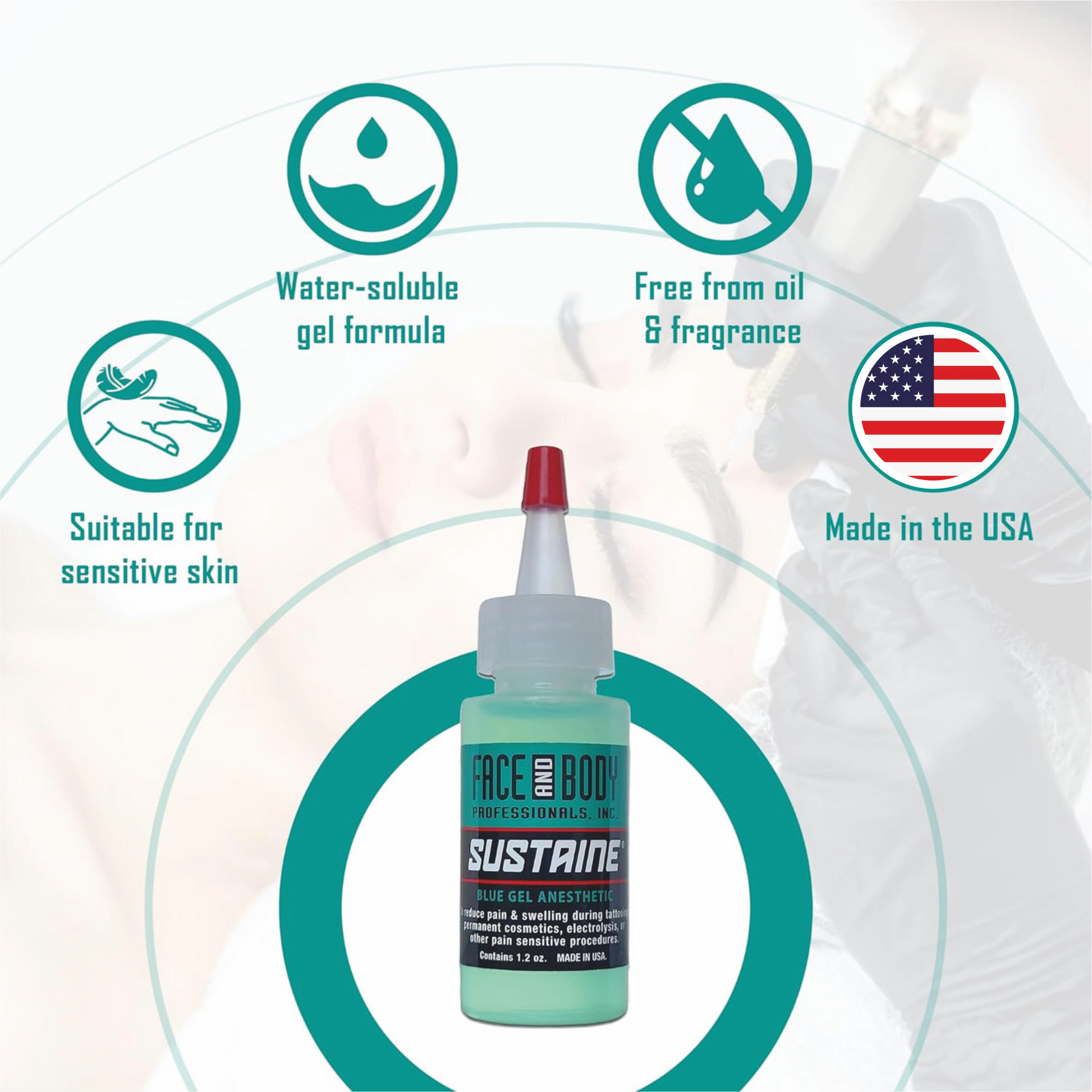 Sustaine Blue Gel é adequado para uso em peles sensíveis, incluindo pálpebras, lábios e sobrancelhas, e é inodoro e seguro para todos os tipos de pele. Este gel anestésico é fácil de aplicar com qualquer aplicador absorvente e faz efeito em apenas alguns minutos, proporcionando até duas horas de alívio sem ser absorvido pela corrente sanguínea ou causar tensão muscular.